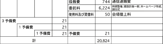 本年度の予算(案)です。協議会を始めとする会議費や事務費、事務調整、例規集の整備、建設計画策定、広報事業などの予算が計上されています。8ページの予算を参照下さい。