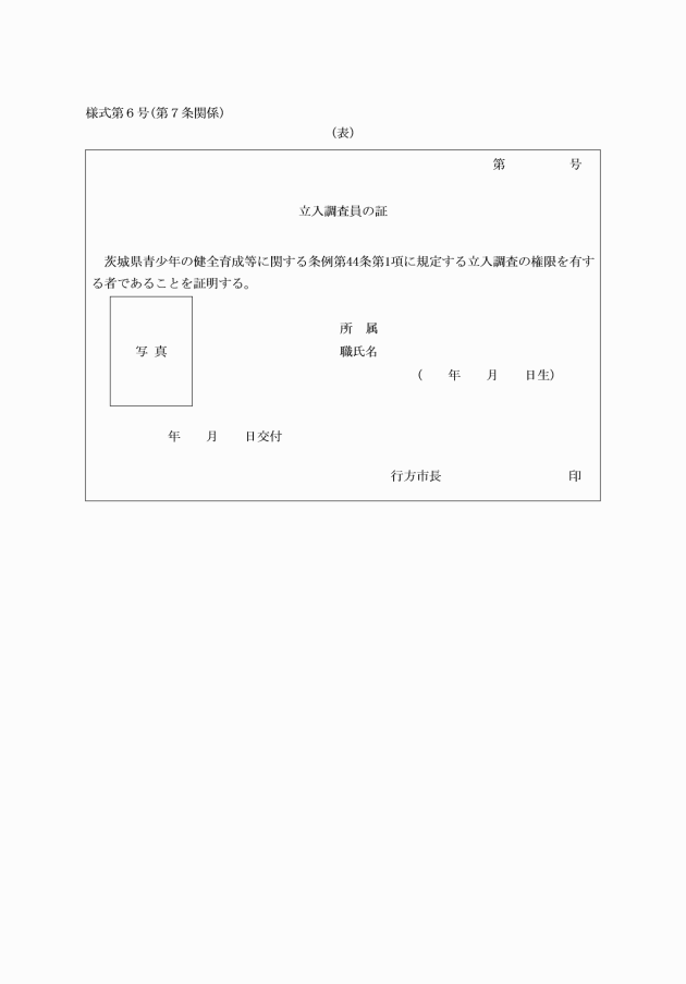 第7条 県条例第44条第2項の規定による身分を示す証明書は,立入調査員の証(様式第6号)によるものとする。