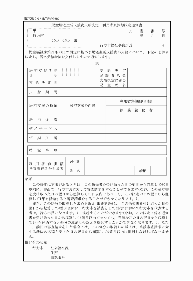 児童特例居宅生活支援費支給(不支給)決定通知書 | ||