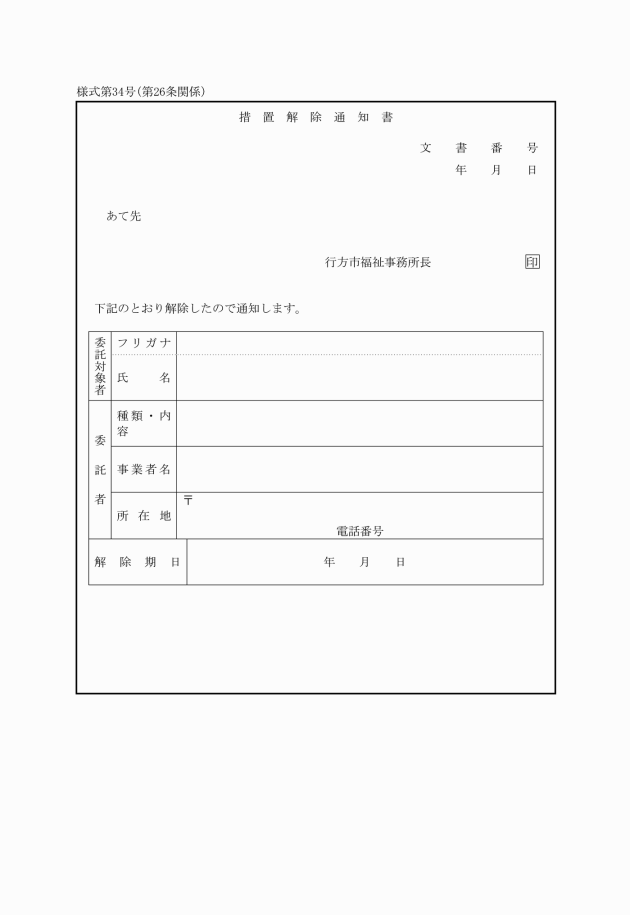 第26条 福祉事務所長は,法第21条の25の規定による措置を解除するときは,措置解除通知書(様式第34号)により当該障害児の保護者及び当該居宅支援提供者に通知しなければならない。