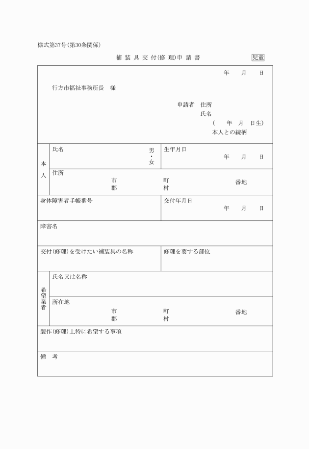 第30条 施行規則第9条第1項の規定による補装具の交付又は修理の申請は,補装具交付(修理)申請書(様式第37号)によるものとする。