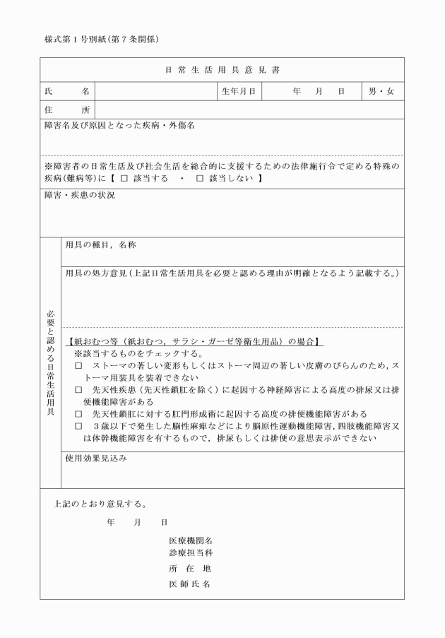 第7条 障害者等又はその保護者(配偶者,親権を行う者,後見人及びその他の者で,障害者等を現に保護するものをいう。)(以下「申請者」という。)が用具の給付を受けようとするときは,日常生活用具給付申請書(様式第1号。以下「申請書」という。)に関係書類を添付し,福祉事務所長に申請しなければならない。
