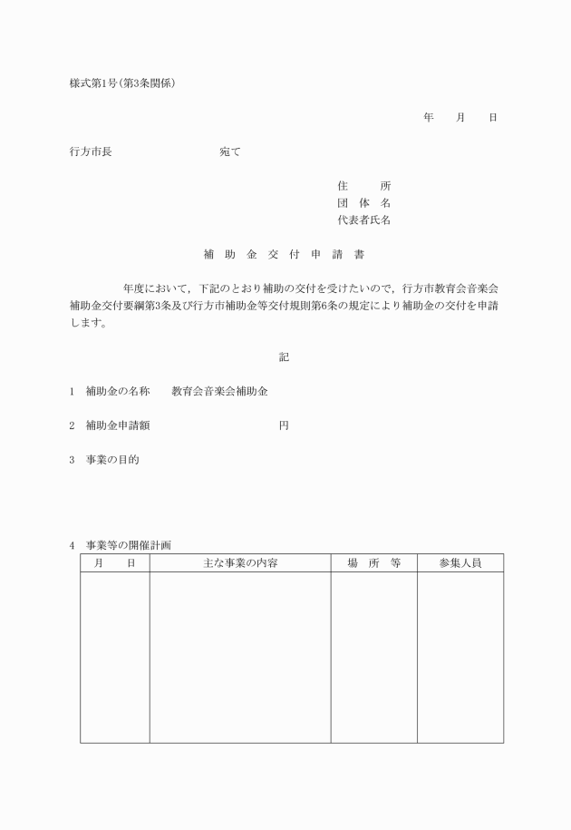 第3条 教育会の会長(以下「会長」という。)は,補助金交付申請書(様式第1号)に事業計画書を添えて,市長に申請しなければならない。