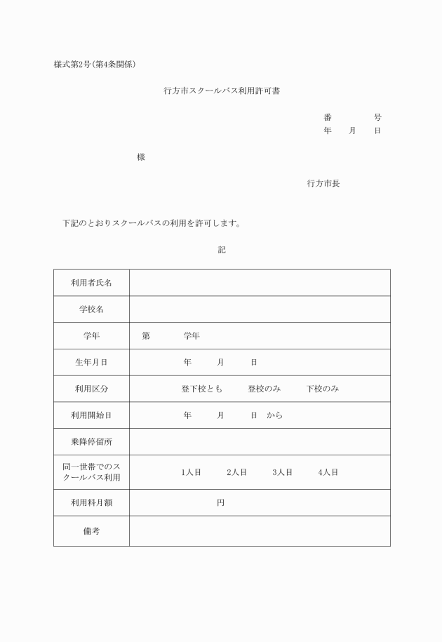 第4条 スクールバスを利用しようとする児童等の保護者(以下「申込者」という。)は,スクールバスの利用を開始しようとする日の1か月前までに,行方市スクールバス利用申込書兼同意書(様式第1号。以下「申込書」という。)により市長に申し込まなければならない。ただし,市長が特別の事情があると認めるときは,この限りでない。