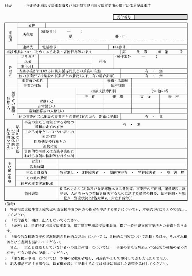 第2条 支援法第51条の20の規定に基づき指定特定相談支援事業者の指定を申請しようとする者及び法第24条の28の規定に基づき指定障害児相談支援事業者の指定を申請しようとする者は,指定特定相談支援事業者・指定障害児相談支援事業者指定申請書(様式第1号)に次に掲げる書類を添えて,市長に申請しなければならない。