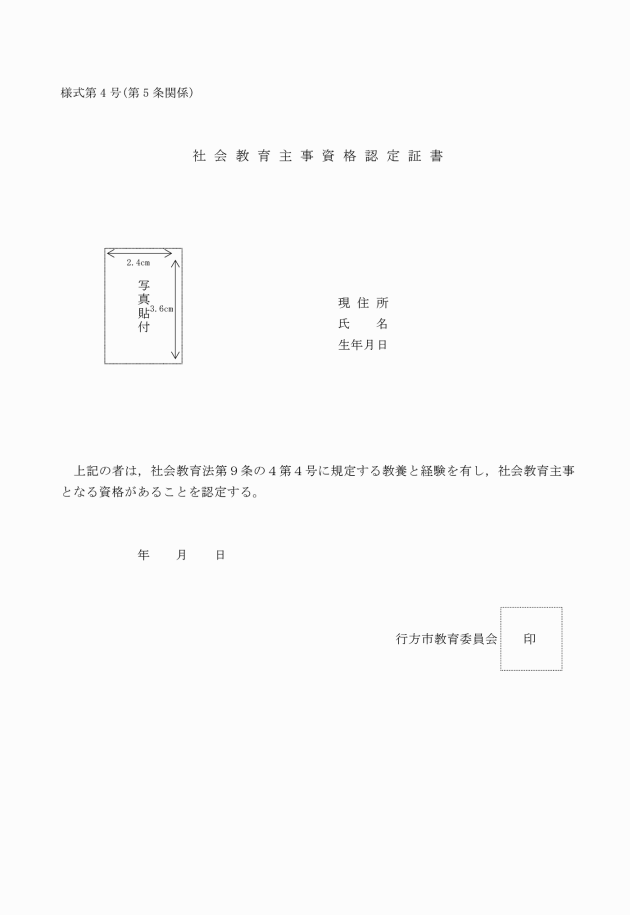 第5条 教育委員会は,社会教育主事の資格を認定したときは,社会教育主事資格認定証書(様式第4号)を申請者に交付するものとする。