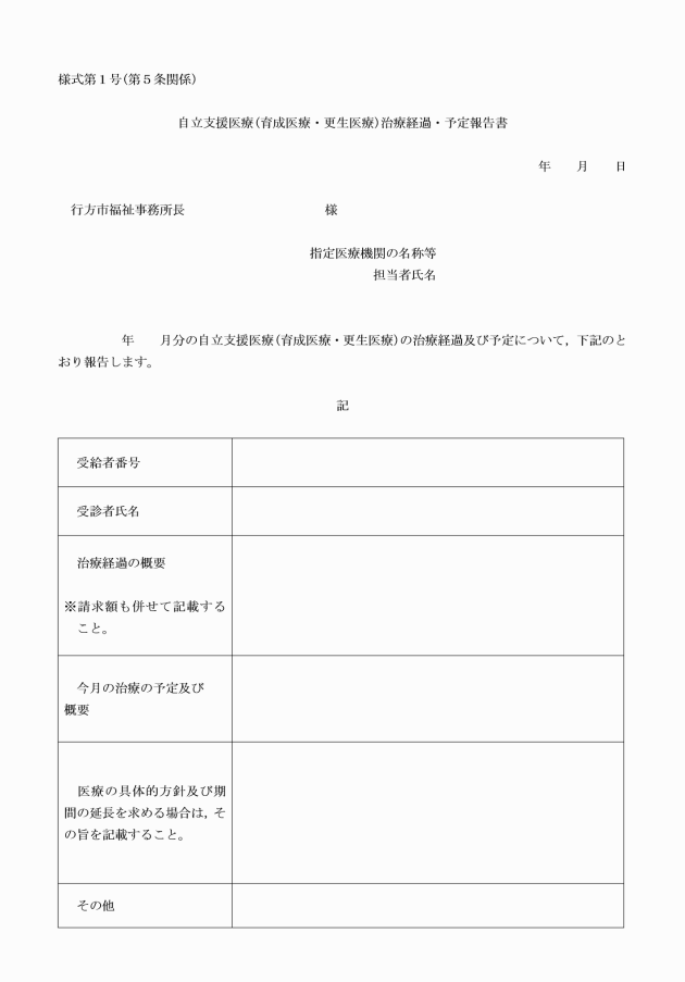 2 行方市福祉事務所長(以下「福祉事務所長」という。)は,指定医療機関に対し,必要に応じ,自立支援医療(育成医療・更生医療)治療経過・予定報告書(様式第1号。以下「報告書」という。)の提出を求めるものとする。ただし,当該指定医療機関が薬局の場合は,この限りでない。