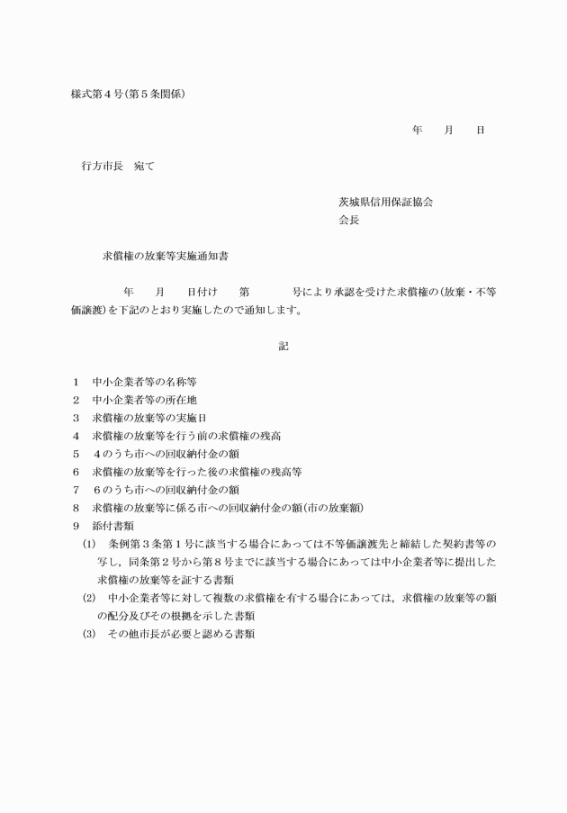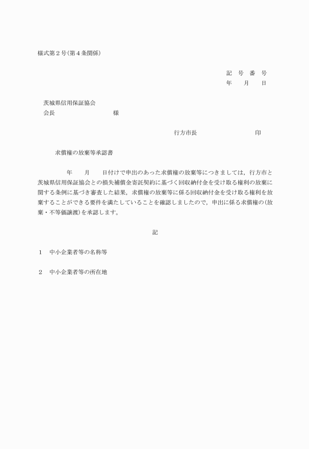 ○行方市と茨城県信用保証協会との損失補償金寄託契約に基づく回収納付金を受け取る権利の放棄に関する条例施行規則