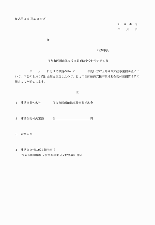 第4条 補助金の交付を受けようとする補助対象者(以下「申請者」という。)は,行方市医師確保支援事業補助金交付申請書(様式第1号)に次に掲げる書類を添えて,補助対象医師との雇用契約締結後速やか市長に提出するものとする。