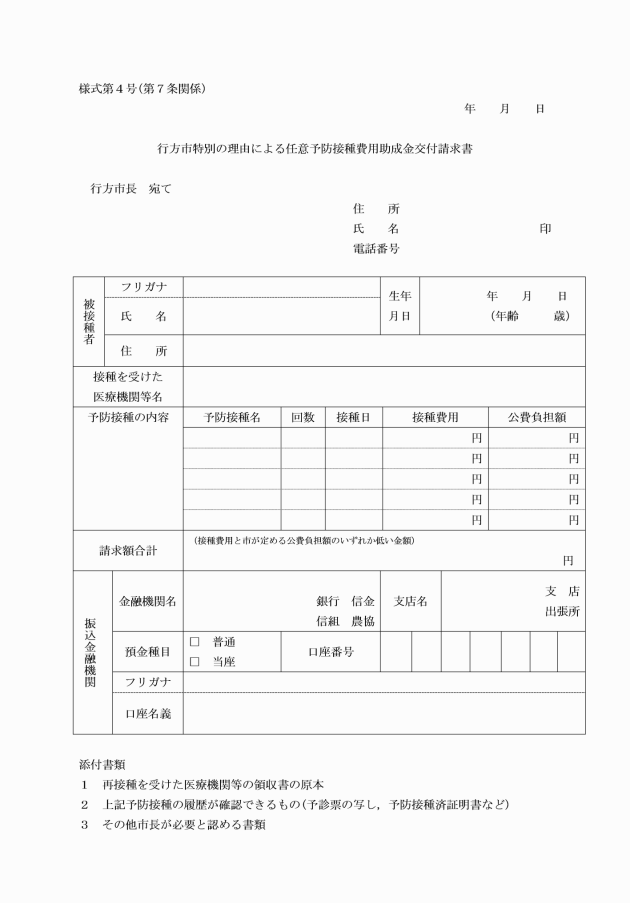 第6条 助成を受けようとする助成対象者は,予防接種を受ける前に,行方市特別の理由による任意予防接種費用助成申請書(様式第1号)に母子健康手帳の予防接種の記録が記載されているページ又は骨髄移植手術その他の理由が生じる以前の予防接種の履歴が確認できるものの写しを添えて,市長に提出しなければならない。