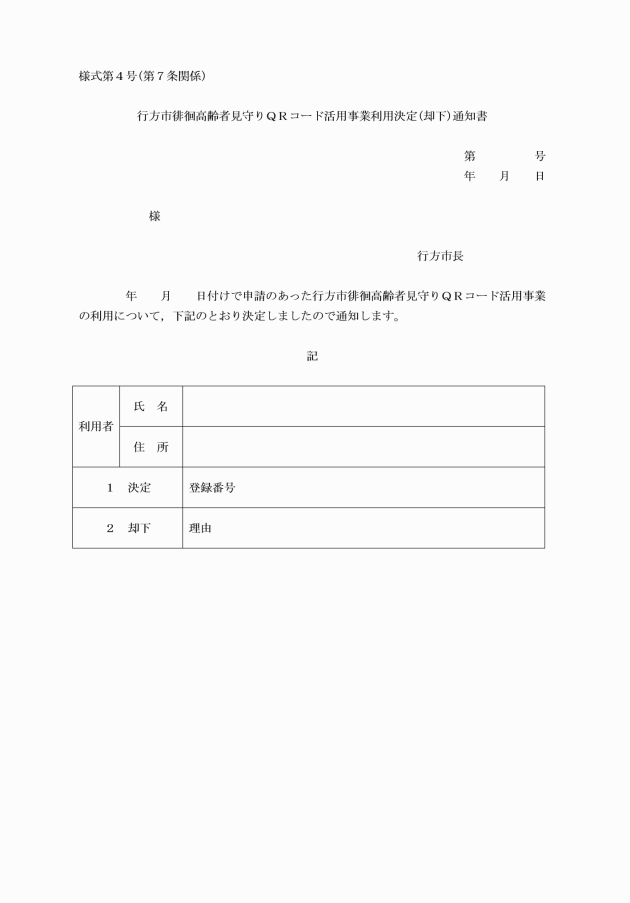 第14条 この事業における見守りQRコードシールの交付に係る費用及び受信センター等の利用料は行方市の負担とし,QRコード追加交付等に係る費用は利用者等の負担とする。