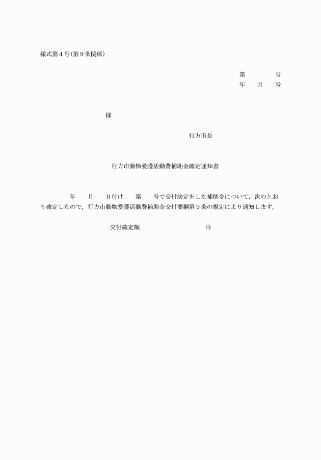 第9条 市長は,行方市動物愛護活動費補助金実績報告書及び関係書類の提出がされたときは,その内容を審査し,適当と認めたときは,補助金の額の確定をし,必要に応じ,当該補助決定団体に行方市動物愛護活動費補助金確定通知書(様式第4号)により通知するものとする。