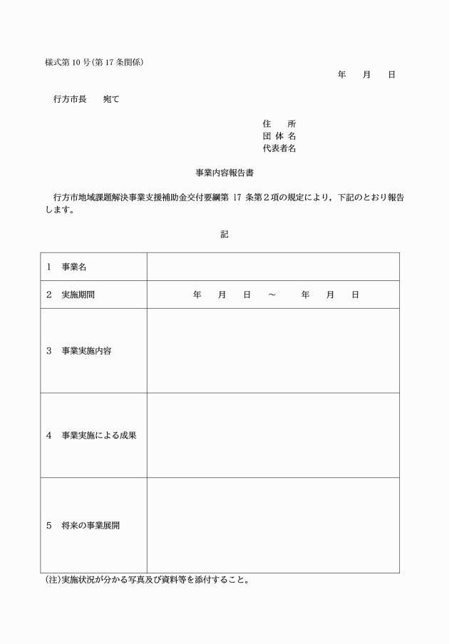 第11条 補助事業者は,当該事業が完了した日から起算して30日以内又は補助事業が完了した日の属する会計年度の3月31日のいずれか早い期日までに,実績報告書(様式第6号)に関係書類を添えて市長に提出しなければならない。