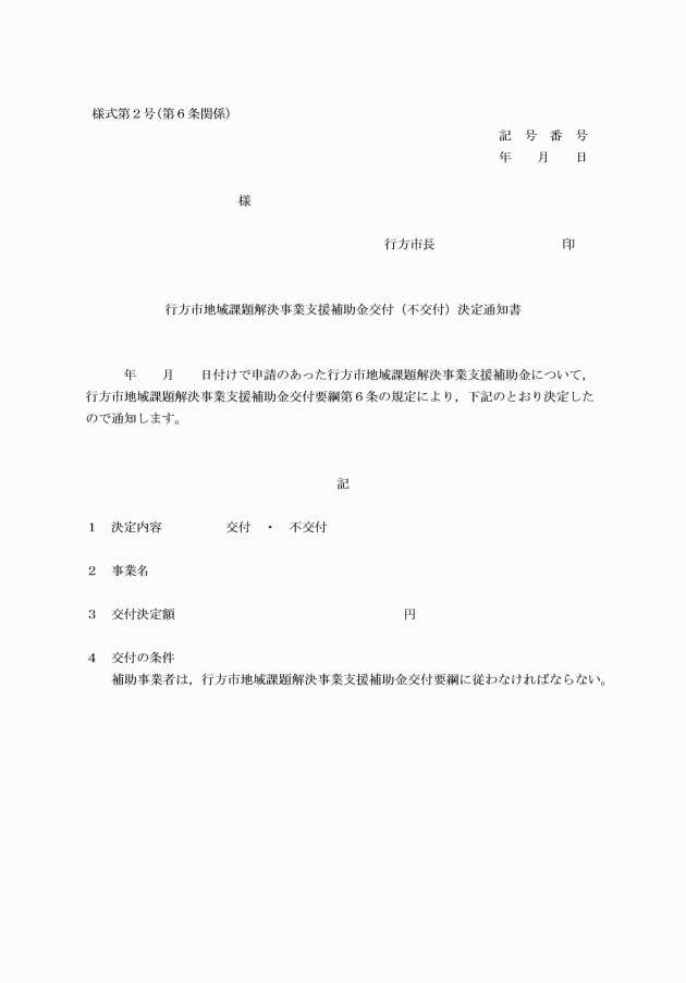 第1条 この告示は,地域経済の活性化及び地域課題の解決を図るため,市内で創業又は新事業を展開する者を支援するため予算の範囲内において交付する地域課題解決事業支援補助金(以下「補助金」という。)に関し,行方市補助金等交付規則(平成17年行方市規則第36号。以下「規則」という。)に定めるもののほか,必要な事項を定めるものとする。