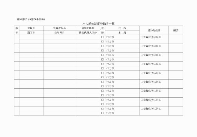第4条 本人通知制度を利用しようとする者は,本人通知制度登録(登録更新)申請書(様式第1号)により,市長に登録を申請しなければならない。