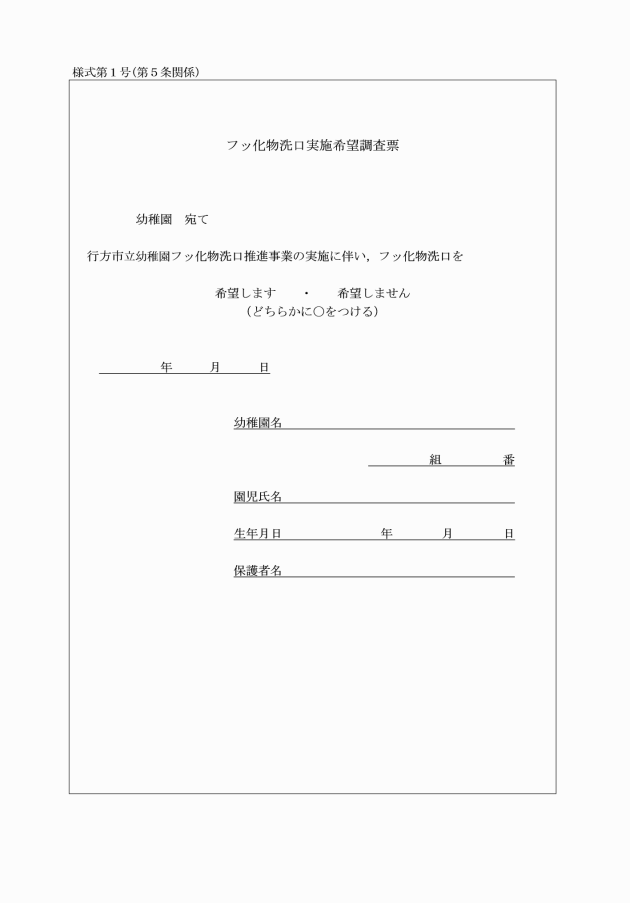 第5条 事業の実施を希望する保護者は,フッ化物洗口実施希望調査票(様式第1号。以下「調査票」という。)を幼稚園に提出するものとする。